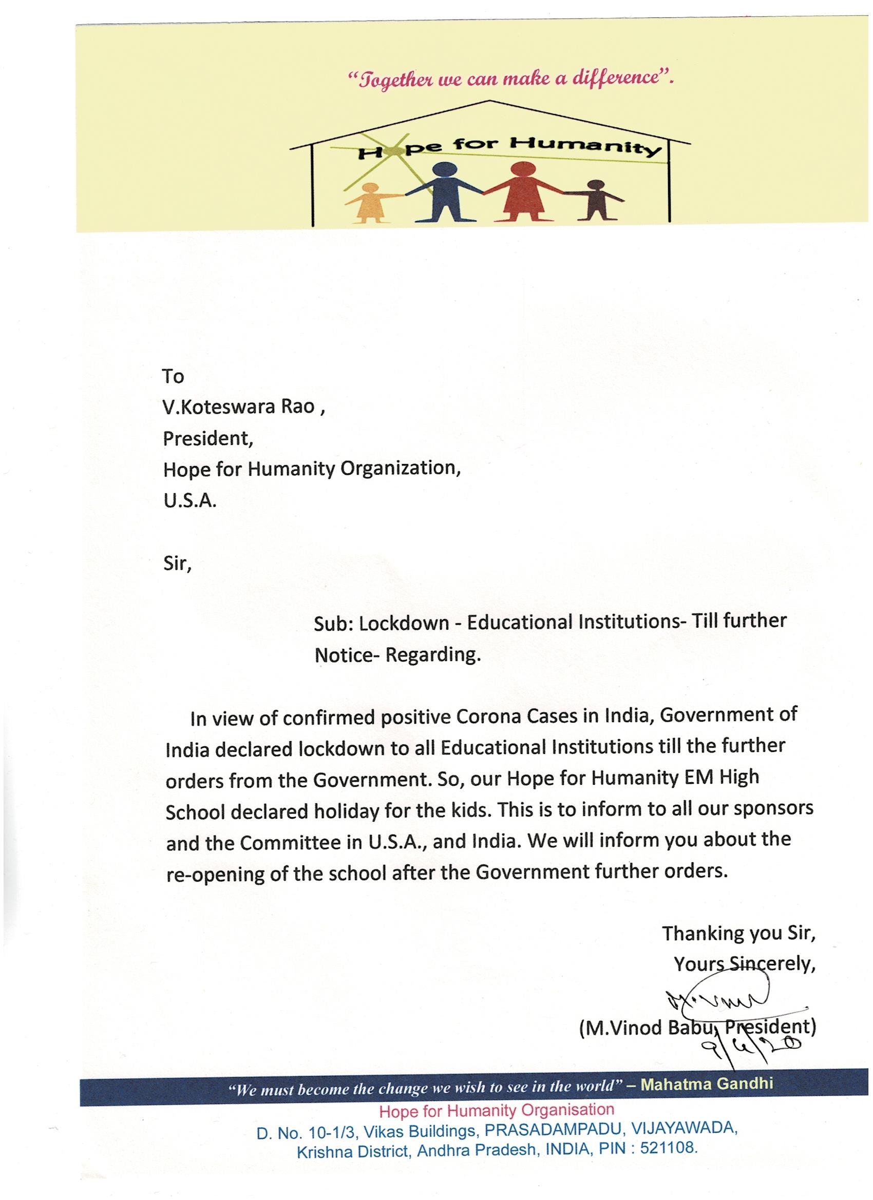 Indian Government has decided to lock down India until May 03, 2020 including all schools because of positive caronavirus cases in India; Just before the lock down started on March 22nd, the school has finished all syllabus required for all grades. Our Hope For Humanity School conducted FAIII ( Fromative Assessment III } just before lock down.